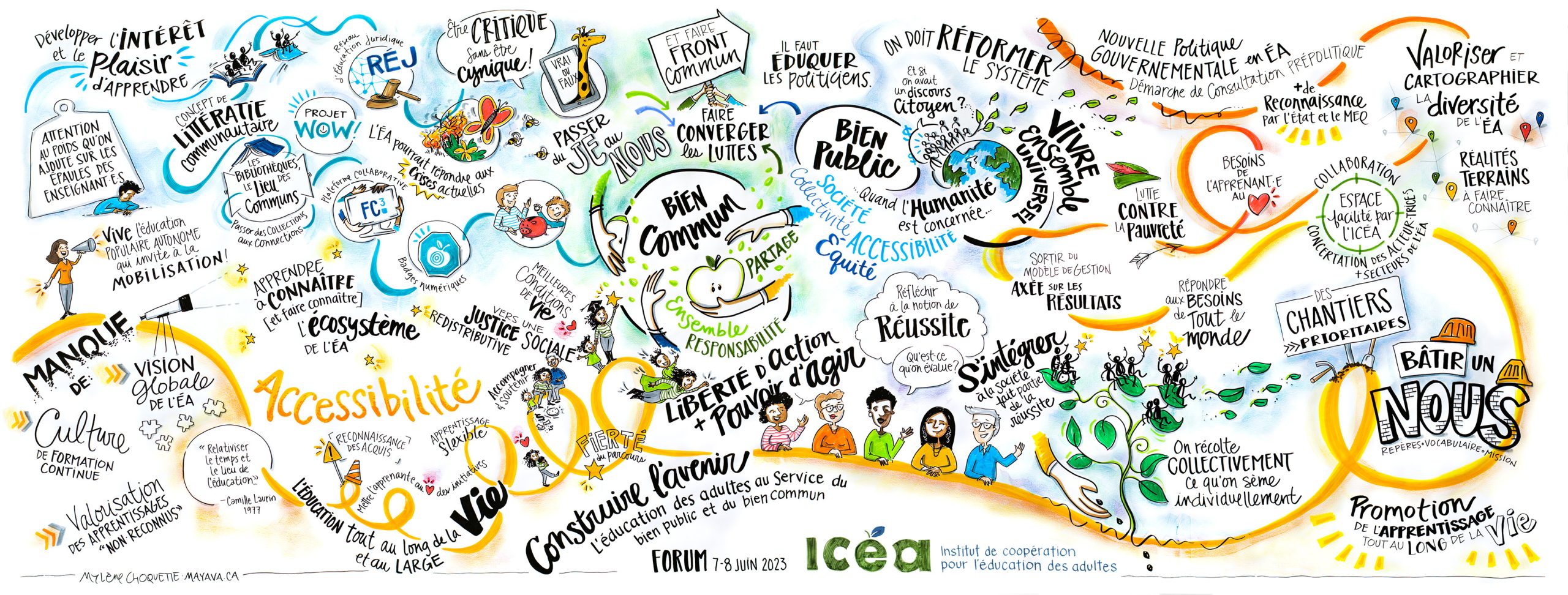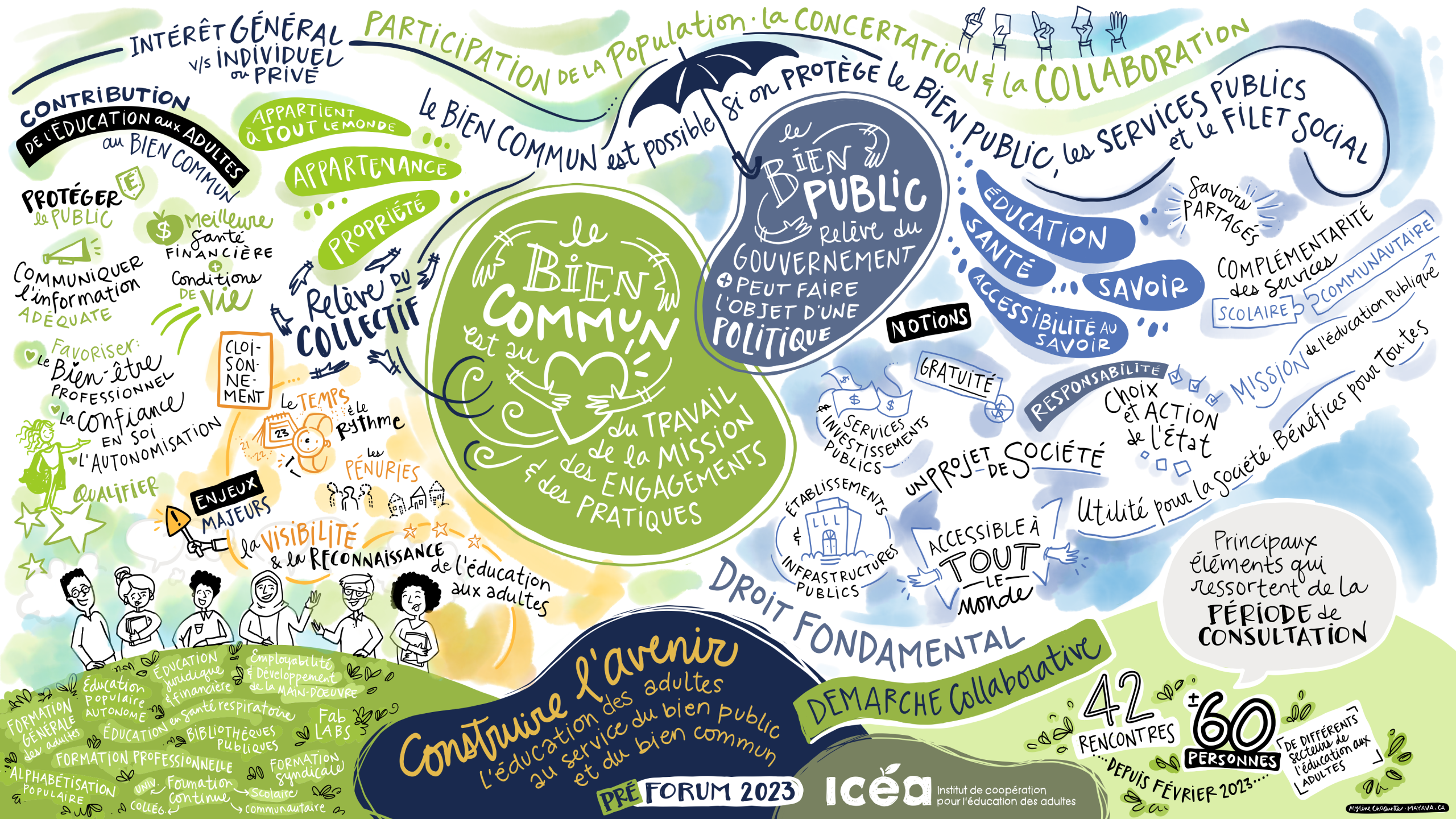 Avant le forum, une fresque a été réalisée par Mylène Choquette (Mayava) pour résumer la démarche et synthétiser les éléments de définition du bien public et du bien commun qui ressortent des entretiens effectués.