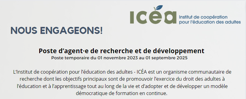 À l’Institut de coopération pour l’éducation des adultes (ICÉA), la personne qui occupe le poste d’agent·e de recherche et de développement en éducation des adultes travaille à concevoir, coordonner et évaluer des activités ou projets dans le cadre de la mise en œuvre du plan de travail et des orientations stratégiques de l’ICÉA.
