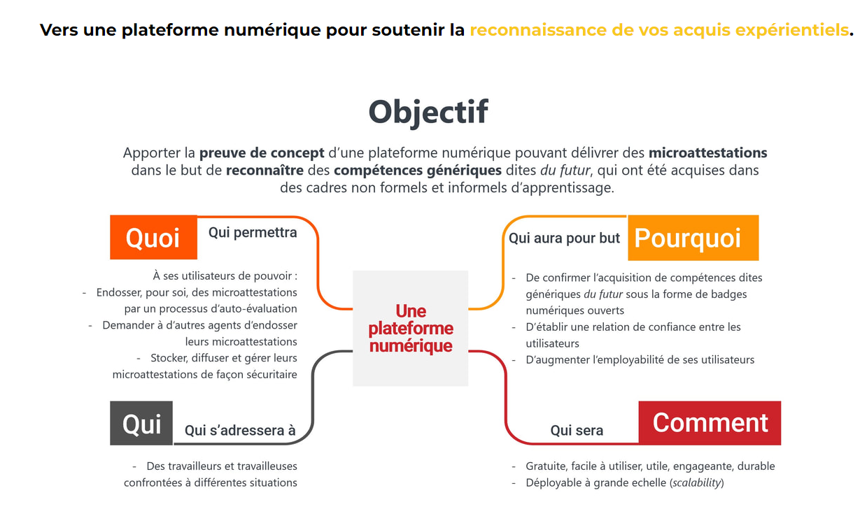 En complément de leurs acquis scolaires, les travailleuses et les travailleurs acquièrent des connaissances et développent des compétences tout au long de leurs multiples expériences de travail. Reconnaître ces acquis permet à ces personnes de les faire valoir auprès de leur employeur ou d’un employeur potentiel. Pour les employeurs, pouvoir compter sur des attestations validées d’acquis expérientiels ou non scolaires est un outil de plus dans l’évaluation de leur personnel en mobilité au sein de leur entreprise ou des personnes embauchées. Depuis quelques années, de nouveaux outils de reconnaissance des acquis ont vu le jour. Il s’agit de microcertifications ou de microtitres. Ces attestations, disponibles sur support numérique, rendent possible la reconnaissance d’acquis pouvant se résumer à des connaissances ou des compétences très précises. Ils sont aussi utilisés pour reconnaître et communiquer des compétences génériques.
