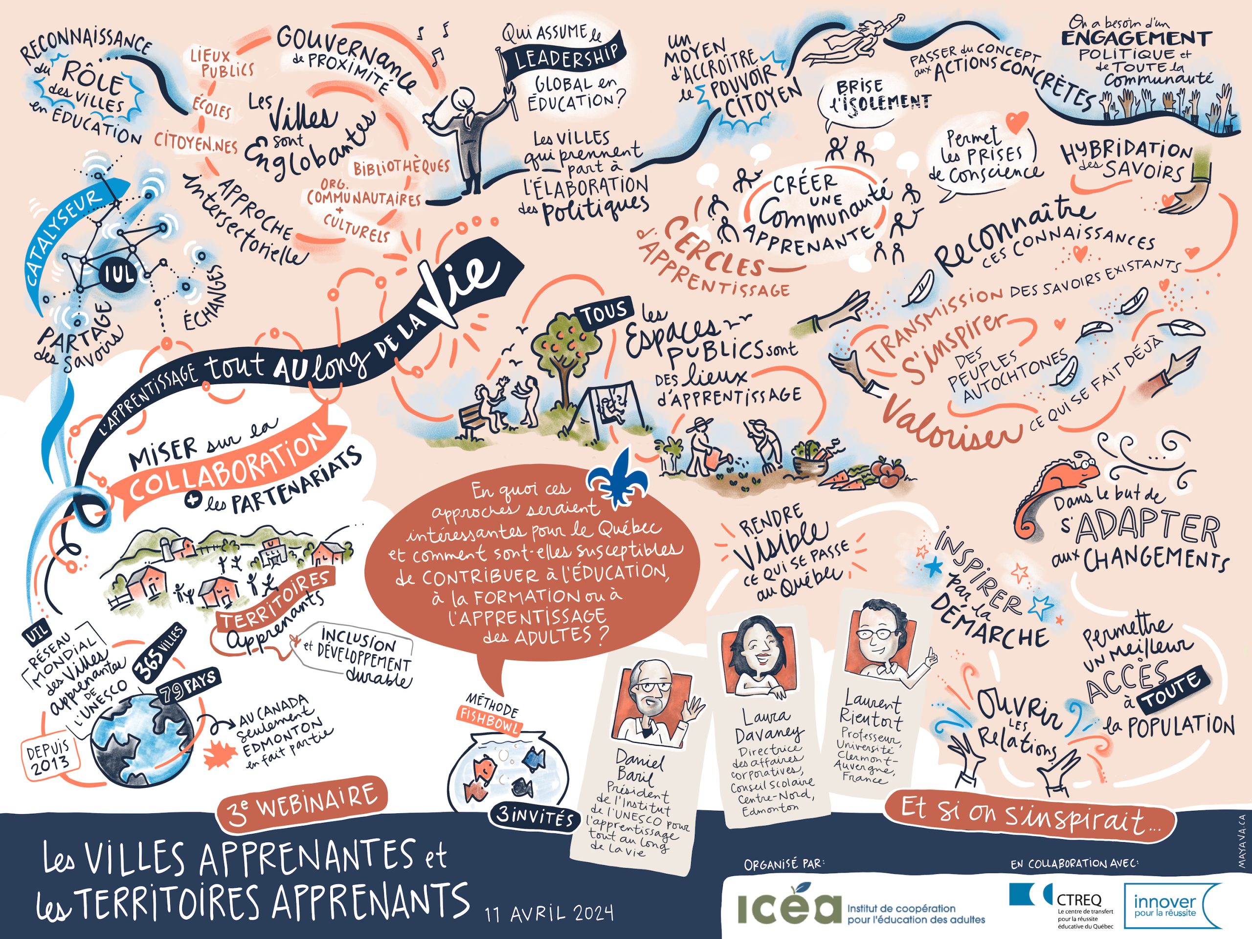 L’ICÉA a lancé le 8 février dernier une série de quatre webinaires interactifs « Et si on s’inspirait pour révéler des actions nécessaires en éducation des adultes ? ». Cette série de webinaires, organisée en collaboration avec le Centre de transfert pour la réussite éducative au Québec (CTREQ), est l’occasion de réfléchir, à l’aide d’exemples de dispositifs, aux actions qu’il serait possible ou pertinent de mettre en place pour répondre à des problèmes existants. C’est aussi l’occasion d’alimenter la réflexion collective sur les contenus d’une éventuelle politique d’éducation des adultes ; la dernière ayant déjà plus de 20 ans. Dans le troisième webinaire, qui s’est tenu le 11 avril 2024, nous nous sommes intéressés aux villes apprenantes et aux territoires apprenants.